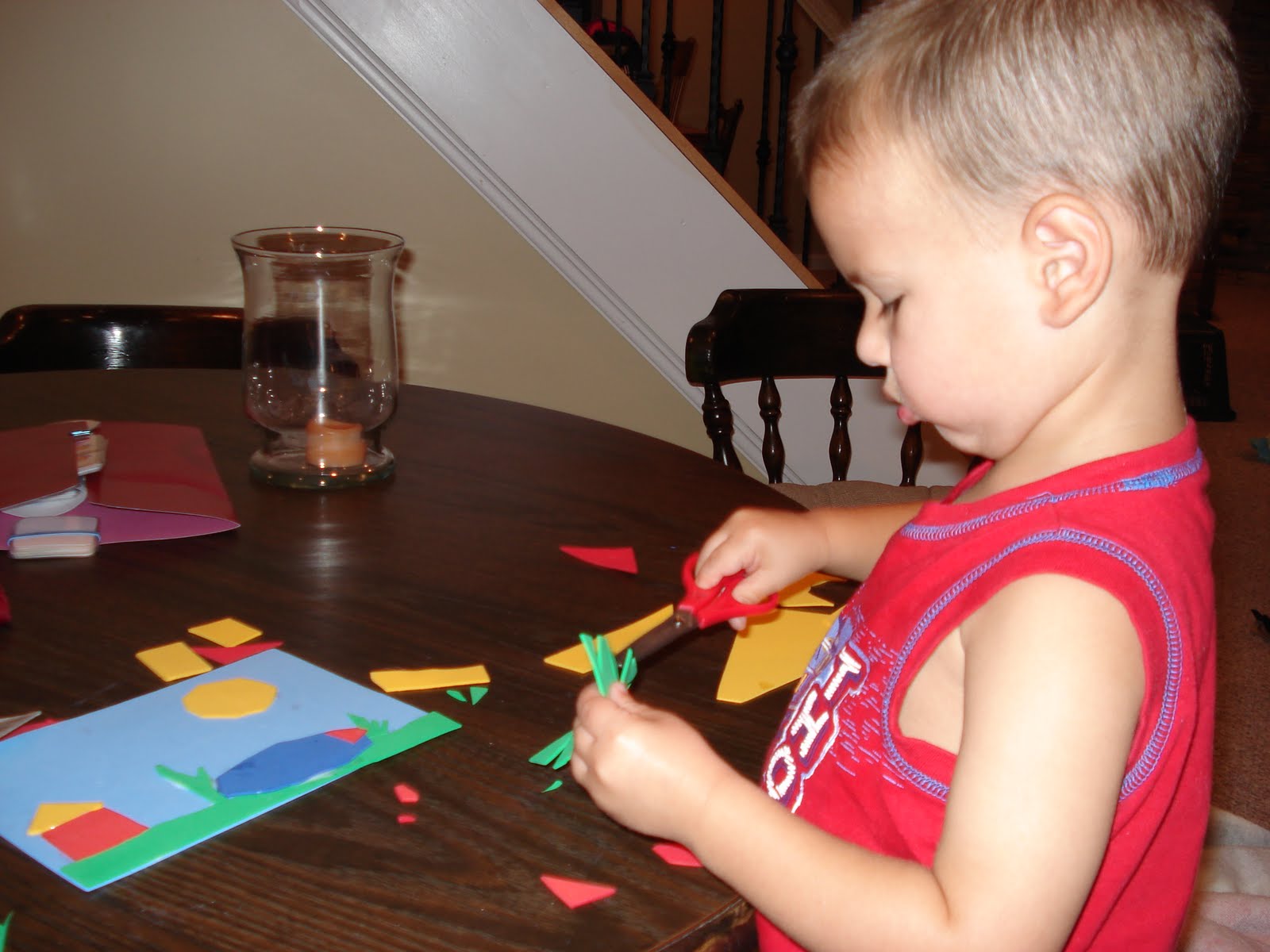 First official time using scissors. We made a picture by cutting out different shapes. He loved this. He is still displaying the picture randomly throughout the day.